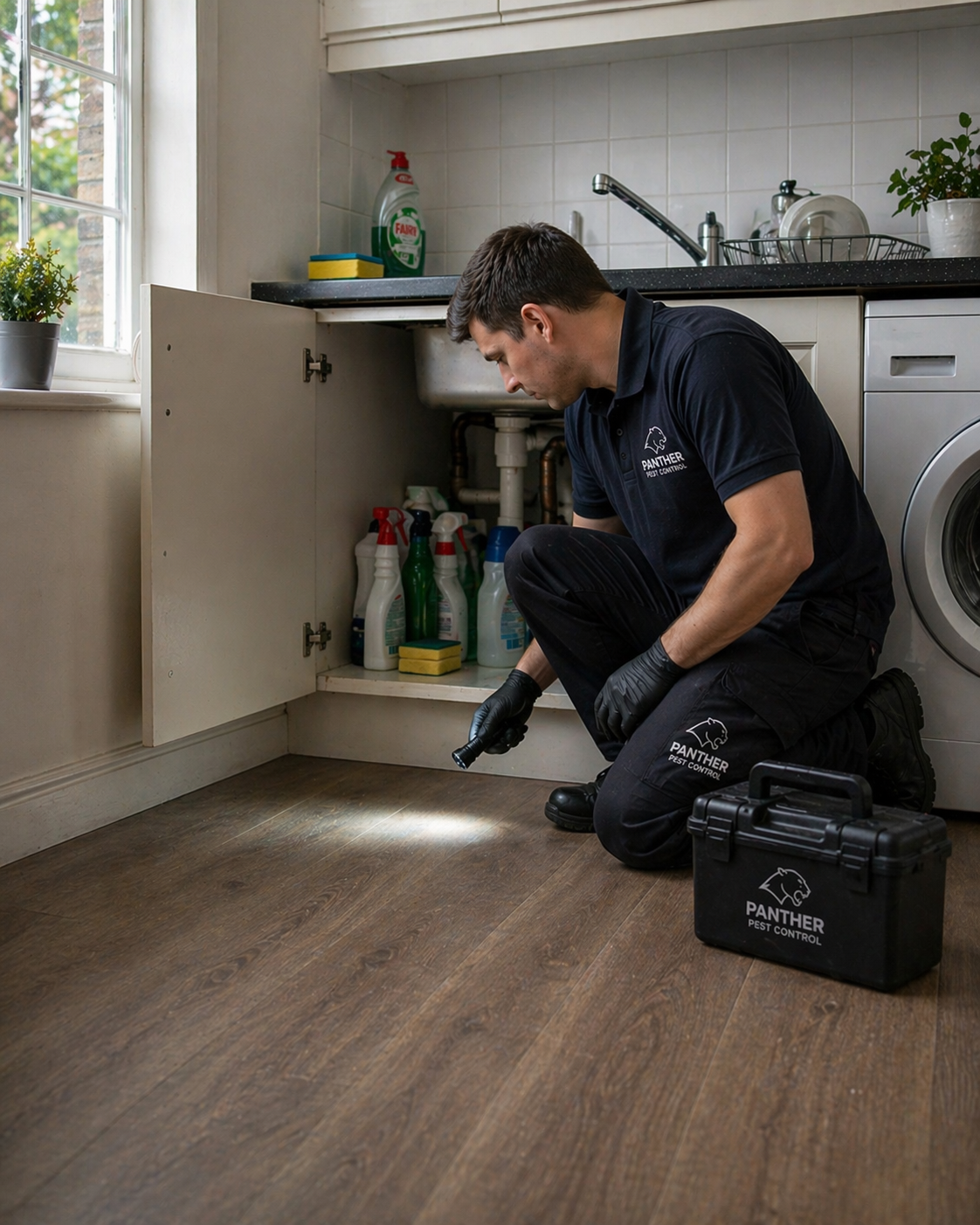 When we arrive, we begin with a practical inspection. This means checking where activity is strongest, identifying likely rodent entry points, and looking at how pests are moving through the property. In a typical flat, this might be under the sink where pipes come through, behind appliances, or along shared walls. In houses, loft spaces and ground-level access points are often involved.