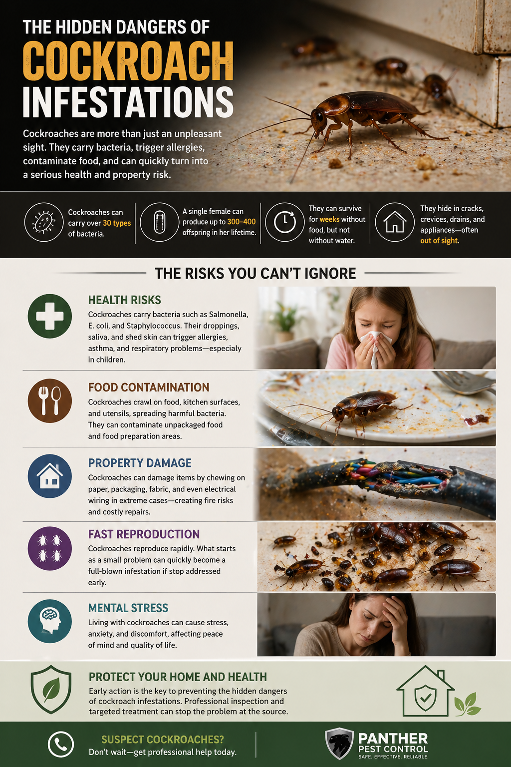Cockroaches are more than just a nuisance; they are a serious health hazard that can have long-lasting effects on your well-being. From spreading diseases to triggering allergies and contaminating food, the dangers of a cockroach infestation are real and should not be underestimated. If you suspect a cockroach problem in your home or business, don’t wait for it to get worse. Contact Panther Pest Control today and let our professionals help you regain control of your environment. With our expertise and commitment to quality, we’ll ensure your space is safe, clean, and free from pests.